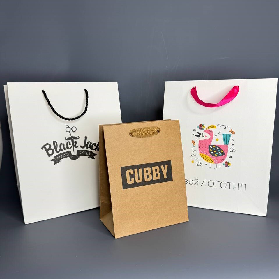 Плотность 170 гр, тканевые ручки, белые и коричневые пакеты).